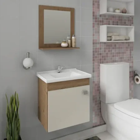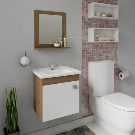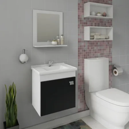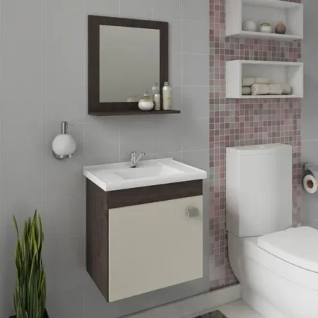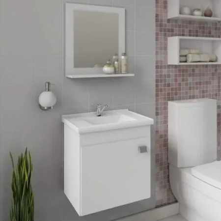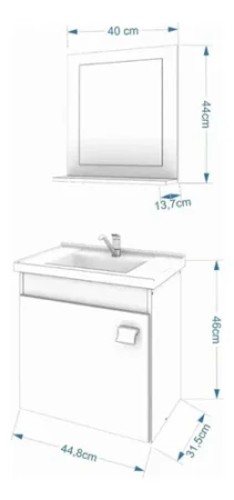 O Gabinete Iris possui estrutura 100% Mdf, tem tamanho 46×44,8 cm e profundidade de 31,5 cm. Possui espelheira com uma prateleira, puxador em Abs, com amplo espaço interno e lavatório 100% mármore sintético com mais durabilidade e resistência.